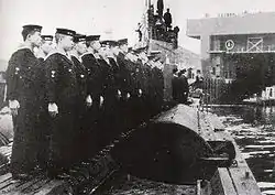 The Kaigun Holland #6 was launched at Kobe on 28 September 1905 and was completed six months later at Kure as the first submarine built in Japan. It sank during a training dive in Hiroshima Bay on 15 April 1910. Although the water was only 58 feet (18 m) deep, there were no provisions at all for the crew to escape while submerged. The commanding officer, Lieutenant Tsutomu Sakuma, patiently wrote a description of his sailor's efforts to bring the boat back to the surface as their oxygen supply ran out. All of the sailors were later found dead at their duty stations when this submarine was raised the following day. The sailors were regarded as heroes for their calm performance of their duties until death,[2] and this submarine was preserved as a memorial in Kure until the end of World War II.[1]