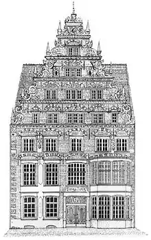 Constructed around 1630, the house at No. 28 (it was earlier No. 112) is one of the best preserved buildings of its kind in the city.[3] Designed at the height of Bremen's development in the Weser Renaissance style, its bay window on the facade was added during alterations in about 1730. Used for centuries as both a residence and for the storage of goods, the building has a large entrance hall with a two-tiered Baroque staircase, the only one of its kind that has remained in place in Bremen.[4][5] The building was changed internally in 1902 after the paint company moved into the building.[6] The Suding & Soeken building is one of Bremen's few historic merchant houses to remain undamaged after the second world war. Since 1973, it has been a listed building.[7] The building has an information plaque with a QRpedia code that links to the English Wikipedia article about the building.[6]