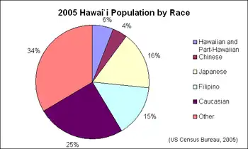 Plantation owners worked hard to maintain a hierarchical caste system that prevented worker organization, and divided the camps based on ethnic identity.[2] An interesting outcome of this multi-cultural workforce and globalization of plantation workers was the emergence of a common language. Known as Hawaiian Pidgin, this hybrid primarily of Hawaiian, English, Japanese, Chinese, and Portuguese allowed plantation workers to communicate effectively with one another and promoted a transfer of knowledge and traditions among the groups.[14] A comparison of 1959–2005 racial categories shows the ongoing shifts.