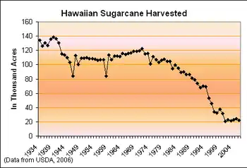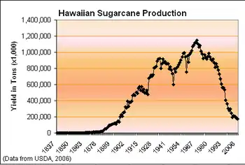 Sugarcane was introduced to Hawaiʻi by its first inhabitants in approximately 600 AD and was observed by Captain Cook upon arrival in the islands in 1778.[1] Sugar quickly turned into a big business and generated rapid population growth in the islands with 337,000 people immigrating over the span of a century.[2] The sugar grown and processed in Hawaiʻi was shipped primarily to the United States and, in smaller quantities, globally. Sugarcane and pineapple plantations were the largest employers in Hawaiʻi.[3] Today the sugarcane plantations are gone, production having moved to other countries.