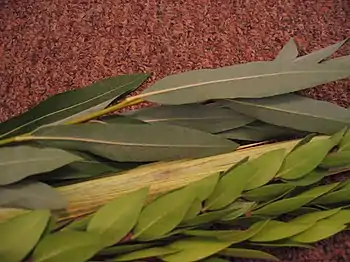 The third chapter of tractate sukkah is titled, "The Stolen Lulav," after the words that begin the Mishna to the third chapter. The chapter deals with the laws pertaining to the verse in Leviticus 23:40 that on the holiday one must take "the fruit of a beautiful tree, branches of a date palm, boughs of a dense-leaved tree, and willows of the brook." The Talmud seeks to determine the identity of these species to fulfill the commandment of the Torah. In addition, it discusses further laws regarding the obligation to take the species, including the number of species to take and the manner in which to take it. Branches of the date is understood to refer to the lulav, a dense leaved tree to the myrtle, and "willows of the brook" refers to the willow. The fruit of the beautiful tree is the etrog. On page 30, the Talmud discusses why a stolen lulav is unfit and explains that it is because it was acquired through transgression. As Rabbi Johanan explains the verse in Isaiah 61:8 states that the Lord hates robbery.[7] On page 32 the story is told of Rav Nahman who was sitting in a sukkah that was built using branches taken from the property of an old lady. She said the sukkah was stolen, but he said the sukkah was valid but she has rights to the monetary value of the wood. [8]On page 32, the Talmud continues the discussion of a lulav that was taken from the grounds of an idol worshipping city. Pursuant to the discussion, the Talmud notes that there is a dispute regarding whether a lulav, or palm branch, taken from the gates of hell, that is the valley of Hinnom by Jerusalem (Gei-Hinnom), may be used to fulfill the obligation. On 32b the Talmud proceeds with an identification of the dense-leaved tree as being synonymous with the myrtle branch. It rejects identification of this tree with an olive tree, an oriental plane tree, and oleander.[9]