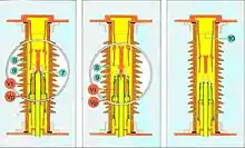 They belong to the medium voltage range, but the transient recovery voltage withstand capability required by IEC/IEEE 62771-37-013 is such that the specifically developed interrupting principles must be used. A particular embodiment of the thermal blast technique has been developed and applied to generator circuit breakers. The self-blast technique described above is also widely used in SF6 generator circuit breakers, in which the contact system is driven by a low-energy, spring-operated mechanism. An example of such a device is shown in the figure below; this circuit breaker is rated for 17.5 kV and 63 kA.