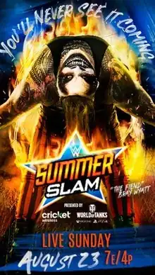 At Money in the Bank, Braun Strowman retained the Universal Championship against Bray Wyatt, who wrestled as his Firefly Fun House character.[21] After being absent for a few weeks, Wyatt returned on the June 19 episode of SmackDown, but was interrupted by Strowman. Wyatt stated their rivalry was just getting started before appearing as his old cult leader persona of The Wyatt Family, which formerly included Strowman and from where Strowman had originally made his WWE debut.[22] This led to a non-title match between the two called the Wyatt Swamp Fight at The Horror Show at Extreme Rules,[23] where Wyatt, fighting as his old Eater of Worlds self, defeated Strowman, who disappeared somewhere in the swamp. As Wyatt tried to leave himself, he was pulled back into the water, only for his alter ego The Fiend to appear.[11] On the following SmackDown, Wyatt stated that his old Eater of Worlds self was done for now and that The Fiend had been unleashed.[24] The following week, Wyatt said that The Fiend wanted the Universal Championship and that no one was safe until he got it, which was made evident later that night when The Fiend attacked Alexa Bliss, Strowman's old tag team partner from Season 1 of Mixed Match Challenge.[25] On the August 7 episode, The Fiend tried attacking Bliss again, who seemingly showed affection for The Fiend, causing him to back off. Strowman then appeared on the TitanTron, stating he did not care about Bliss and that he emerged a monster from the swamp. Strowman then accepted The Fiend's challenge for the Universal Championship at SummerSlam.[26] The following week saw Strowman attacking Bliss to lure out The Fiend, who appeared in the ring to confront Strowman.[27] On the August 22 episode of Talking Smack, the stipulation was changed to a Falls Count Anywhere match.[28]