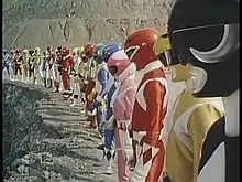 All 25 Sentai Heroes gathered from five different teams. From closest to furthest: Zyuranger, Dairanger, Kakuranger, Jetman, and Fiveman.