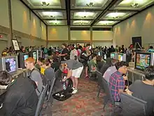 Competitive Melee experienced a resurgence in popularity and support after it was again hosted at EVO 2013 after the game won a charity drive to decide the final game to be featured in its tournament lineup.[8][9] Due to its large turnout and viewership that year, EVO continued including Melee in its lineup for the next five years. The competitive scene was also further popularized by the 2013 release of The Smash Brothers documentary series directed by Travis "Samox" Beauchamp.[10] SmashBoards estimated that in 2014 around 3,242 events featuring a Smash Bros. game had occurred worldwide.[11] This period saw a number of new and revived major tournament series enter the scene, including GENESIS, Super Smash Con, Community Effort Orlando (CEO), DreamHack, Major League Gaming (MLG), Shine and the Smash Summit invitational series. Other major tournament series included Apex and The Big House. Apex 2015 was officially sponsored by Nintendo of America, marking the first official Nintendo sponsorship of a community-run event[12] while EVO 2016 was the largest Melee tournament of all time, with 2,376 entrants.[13] In June 2014 Nintendo held an invitational Super Smash Bros. for Wii U tournament at E3 2014 to promote the game, in which various competitive Smash Bros. players competed in a non-standard ruleset.[14] Smash Sisters, an initiative aimed at normalizing the participation of women at tournaments, held its first all-women bracket at GENESIS 3 in 2016.[15][16]
