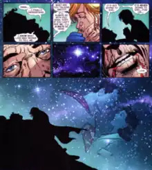 Soon after their arrival on Earth-Two, the Earth-Two Lois dies after telling Kal-L she was happy to have lived such a long life. Kal-El hears Kal-L's screams of sorrow from the current Earth and investigates. A griefstricken Kal-L angrily attacks Kal-El upon his arrival, blaming him for corrupting Earth-Two as he did his own Earth. During the fight, both Supermen experience lucid visions of the other's life and try to change things on the other's Earth for the better. However, they both fail.[16][17]