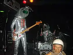 While not as elaborately staged as other theatrical bands like The Aquabats, Supernova's live shows were characterized by a heavy science fiction-themed visual aesthetic. The band members most often entered the stage wearing shiny silver jumpsuits and custom-made space helmets, removing the latter to frequently reveal bizarre hairstyles or facial hair. Tin foil was a crucial element of the band's style: both Collins' drum kit and Mitchell's bass guitar were covered in foil, and the band would hand out sheets to audience members so they could create their own accessories. Fans were encouraged to wear tin foil to Supernova shows - with most venues offering ticket discounts for those who did - and, at the insistence of the band, attempt to pelt the members in the face with foil balls during the show. Mitchell often incited mass foil attacks by frequently making the often-disputed claim that he had never been successfully hit in the face.