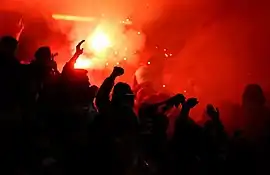 The supporters of Benfica, who are called benfiquistas, have played an important part in the club's growth during its 119-year existence. One of those cases was in the early days of the construction of the original Estádio da Luz, when club president Joaquim Ferreira Bogalho asked them for free concrete to build the stadium. They responded by offering 900,000 tons.[2] During the Portuguese Estado Novo, the Censorship Services prohibited national newspapers from referring to the football team as Vermelhos (Reds), so it was not confused with communism. Instead, the team was referred to as Encarnados (Flesh-coloured), which is still used, even after the transition to democracy.[3][4]