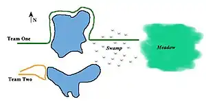 In Episode 7, "Deep Woods, Part 2," both teams started out at relatively the same spot (see map, right). Each team was told to head east, pass through the swamp, and arrive in the meadow. Neither team was told that a lake lay in their path. The shortest course for each team would be to pass between the lakes. Team One navigated east correctly, but then took the long way (north) around the lake. Their five-hour hike turned into a 10-hour trek. Team One arrived at the meadow, however. Team Two's navigation was errant, and the team traveled east for only a short time before drifting east-southeast. When Team Two reached the lake, they became lost and turned north when they thought they was going south. Team Two then mistakenly doubled back to its starting point and never made it to the meadow.[16]