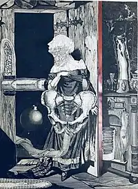 In the 1970s, Sensemann focused on small egg-tempera and oil paintings of feminist archetypes such as Salome and Magdalene and "fantastic landscapes"[22] of dense, brightly colored botanical imagery that flirted with both realism and abstraction.[12][21] Her move to Chicago in 1979 inspired a shift to abstract, architectonic work that nonetheless suggested actual spaces.[12][21] Often titled after mythological goddesses, the new paintings explored the spirit and psychological implications of austere interiors that symbolized the domain of women.[7][23] Sensemann enlivened the spaces with ghost-like whorls or spirals that hinted at kinetic energy, "spiritual emanations"[7] or traces from unseen or absent actors and encounters.[16][15][24] She initially based the works on architectural forms she photographed on trips to Italy ("Tusculana" series)[25] or Japanese art and kabuki forms,[12] before turning to structures from pre-Renaissance paintings by Duccio, Fra Angelico, Giotto and Piero della Francesca in the "Annunciation" works (1983–4).[26][27][12]