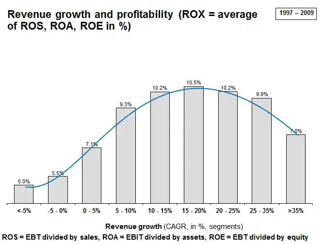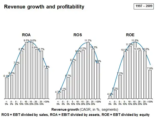 Return on assets (ROA), return on sales (ROS) and return on equity (ROE) do rise with increasing revenue growth up to 10 to 25% and then fall with further increasing revenue growth rates.