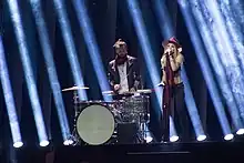 The Swiss performance featured the members of Zibbz performing on stage; Corinne Gfeller wore a short top with strings, skinny jeans and a maroon hat while Stee Gfeller wore a leather jacket with a white shirt underneath. The performance began with the duo at the main stage on a podium, after which Corinne stepped off to make use of both bridges and outer ring of the stage. Before the final chorus, the duo both held flares with Corinne shouting "This is for everybody who has ever been hurt!" before walking back onto the main stage to conclude the performance.[24][25] Zibbz was joined by three off-stage backing vocalists: the co-composer of "Stones" Laurell Barker, Nita Fernandes and Sabrina Kern.[26]