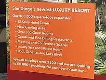 The move toward casino gaming on the Sycuan Band reservation was spearheaded by the Sycuan Band's former chairwoman, Anna Prieto Sandoval.[5] The Sycuan Band opened its first gambling facility, the Sycuan Bingo Palace, on their reservation in 1983.[6] As a direct evolution from that successful venture, they now run a profitable casino, as well as an off-reservation golf course. The Sycuan band is not the only San Diego-area band to operate significant commercial enterprises off-reservation.