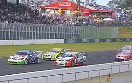 The circuit first hosted a championship round of the ATCC (now known as V8 Supercars) in 1992 and held a round every year, excluding 1998 and 2006, until 2008. Further to this, the circuit hosted the season-ending Grand Finale in 2003 and 2004, with Marcos Ambrose winning the round and the championship title on both occasions.[12] In 2009 the circuit was dropped in favour of the Sydney 500 on the Sydney Olympic Park Street Circuit.[13] The circuit returned to the V8 Supercars calendar in 2012 after V8 Supercars failed to secure a second international event.[14] After another year off the calendar in 2013, the circuit has returned to the calendar from 2014 onwards.