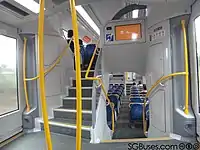 Carriage interiors were designed by Transport Design International.[10] The inside of the train includes additional Emergency Help Points and CCTV cameras compared to older classes. Improvements to the DVAs (Digital Voice Announcements) with differential pitch of the voice allow more natural sounding speech. 'Smart' air-conditioning automatically adjusts to the outside temperature and the number of passengers on board.[11] Accessibility features include 16 wheelchair spaces, portable wheelchair ramps in the end cars, red fabric on priority seating and additional handrails compared to older trains in the fleet.[9]