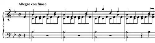 The third movement, a rondo, features dramatic contrasts of piano and forte in its main theme.