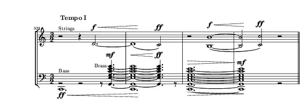 \new Staff \relative c { \key c \major \time 3/2 \clef bass << { s4 r8^"Bass" a,4--^\< b4-- c4-- d4-- e8--~ | e8\! \stemUp f4-- g4--^\> a4-- b4-- c4--\! d8--^\p| } \\ { \stemDown s8_"Timp." \grace { \stemDown g,16 [g16] } g4^> s8 s2 s2 | s2 s4_"Timp." s8 g8~ \trill\p\< g2\! | es'4. \trill\mf r8 s16 } >> } >> }](../I/f44bff9bbb5278d8dd999599eb510b7e.png.webp)