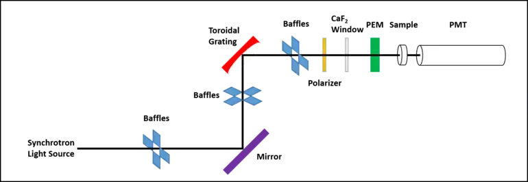 As shown in the diagram, a number of baffles are used throughout to remove possible stray light being reflected off the sides of the beamline tube. The use of only one mirror minimizes the loss of photon flux which is most important in the VUV region where reflectivity is poor relative to the visible wavelength range.[9]