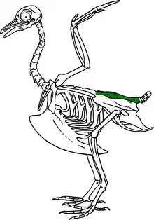 The synsacrum is a skeletal structure of birds and other dinosaurs, in which the sacrum is extended by incorporation of additional fused or partially fused caudal or lumbar vertebrae. This structure can only be seen in birds. Some posterior thoracic vertebrae, the lumbar, sacral and a few anterior caudal vertebrae are fused to form a complex bone called synsacrum. The innominate bones are fused with the synsacrum to a greater or lesser extent, according to species, forming an avian pelvis. This forms a more extensive rigid structure than the pelvis of a mammal, fulfilling requirements for flight, locomotion and respiration. Posterior to the synsacrum there are a few free caudal vertebrae, the last of which is the pygostyle to which the long, stiff tail feathers are attached. The central section of the synsacrum is swollen to accommodate the glycogen body, an organ whose function is as yet unclear but which may be associated with balance. [1]