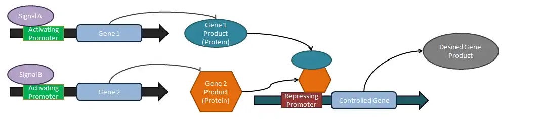 Toggle switch which operates using two mutually inhibitory genes, each promoter is inhibited by the repressor that is transcribed by the opposing promoter. Toggle switch design: Inducer 1 inactivates repressor 1, which means repressor 2 is produced. Repressor 2, in turn, stops transcription of the repressor 1 gene and the reporter gene.[14]