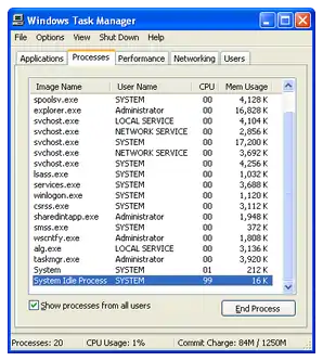 Because of the idle process's function, its CPU time measurement (visible through, for example, Windows Task Manager) may make it appear to users that the idle process is monopolizing the CPU. However, the idle process does not use up computer resources (even when stated to be running at a high percent). Its CPU time "usage" is a measure of how much CPU time is not being used by other threads.