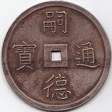Tự Đức Thông Bảo (chữ Hán: 嗣德通寶) was an inscription used on different coins made from various metals and alloys during the reign of Emperor Tự Đức.[8] The coinage of Tự Đức saw the introduction of the term văn (文) which was an accounting unit used for copper-alloy cash coins denominating their worth in number of zinc cash coins with a weight of 6 phần.[9][10]