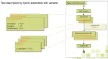 In TPT tests are modelled graphically with the aid of special state machines and time partitioning.[1][3] All test cases for one system under test can be modelled using one hybrid automaton. Tests often consist of a sequence of logical phases. The states of the finite-state machine represent the logical passes of a test which are similar for all tests. Trigger conditions model the transitions between the test phases. Each state and transition of the automaton may have different variants. The combination of the variants model the individual test cases.