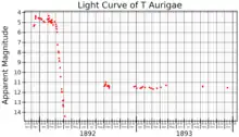 Strope and Schaefer report that the peak brightness of T Aurigae was magnitude 4.5,.[8] Pre-discovery images on photographic plates allowed the a light curve beginning in late 1891 to be constructed.[7] AAVSO data shows that T Aurigae's quiescent magnitude is 15.3.