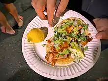 In a 2019 report from Timeout, some of the highest highest-rated taco trucks in Los Angeles include Mariscos Jaliscos, Leo's Taco Truck, Kogi BBQ, Carnitas El Momo, and Teddy's Red Tacos.[21] Most taco trucks have expanded their food options to include specialty tacos and other common Mexican foods to appeal to more customers. Mariscos Jaliscos features Mexican Mexican-style tacos topped with all different kinds of seafood, their specialty.[22] Leo's Taco Truck offers a wide selection of customizable Mexican food beyond their traditional tacos, including burritos, tamales, tostadas, Cuban tortas, fresh juice, and horchata.[23] Carnitas El Momo, featured in the Netflix documentary Street Food: USA, entertains a wide variety of customizable meats and salsas.[9][21] Teddy's Red Tacos customizes birria tacos, a Mexican style dish native to Jalisco, Mexico.[21] Kogi BBQ, arguably the most popular fusion taco joint in Los Angeles serves their world-famous rib tacos from a fleet of Kogi trucks spread throughout the city. Some of these popular taco trucks have permanent parking spots where others continue to publish their movement through the streets on social media platforms. Many of these taco trucks have been able to expand to standing restaurants while still retaining their trucks for catering events. Whether it be Central Los Angeles, Alameda, South Los Angeles, or just outside the Fashion District, taco trucks are a common sight.[3] Taco trucks in Los Angeles have navigated their way to the forefront of the everchanging food industry in Los Angeles.
