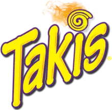 Takis are a Mexican brand of rolled corn tortilla chip snack made by Barcel, a subsidiary of Grupo Bimbo. Fashioned after the taquito, it comes in numerous flavors,[1] the best selling of which is the chili-lime "Fuego" flavor, sold in distinctive purple bags. Besides the rolled corn chips, Takis also produces a number of other snacks with the same flavor lines, including a number of different potato chip varieties, corn stix, popcorn, and peanuts.