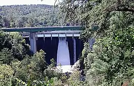 Tallulah Falls Lake was formed in 1914 with the completion of the Tallulah Falls Dam, a concrete dam with diversion tunnel. The diversion tunnel is 11 feet (3.4 m) wide, 14 feet (4.3 m) high, and 6,666 feet (2,032 m) long and was tunneled through solid rock and then lined with concrete. The dam is 126 feet (38 m) high and has a span of 426 feet (130 m). The Tallulah Falls Hydroelectric Plant is located 608 feet (185 m) lower than the dam at the lower end of the tunnel and has a generation capacity of 72,000 kilowatts.