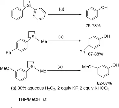 10. 1 2 Sunderhaus, J D.; Lam, H.; Dudley, G B. (2003), "Oxidation of Carbon−Silicon Bonds: The Dramatic Advantage of Strained Siletanes", Org. Lett., 5 (24): 2120–2122, doi:10.1021/ol035695y, PMID 14627386