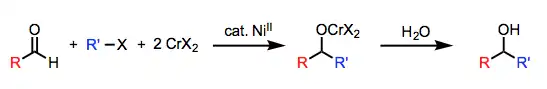 It was originally discovered in 1977, where Hiyama and Nozaki reported a chemospecific synthesis of homoallyl alcohols from an aldehyde and allyl halide using chromium(II) chloride.[7] In 1983, Hiyama and Nozaki published another paper extending the scope of the reaction to include aryl and vinyl halides.[8] In 1986, Nozaki and Kishi independently discovered that the reaction depended on the nickel impurities in the chromium(II) chloride salt.[9][10] Since then, nickel(II) chloride has been used as a co-catalyst.[11]