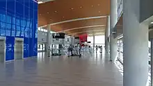 Airside F was added to the airport in 1987 along with an additional shuttle line. Airside F's shuttles included new second-generation C-100 vehicles, and it would be the first airside system to include two-car trains.[10] Airside F's shuttle station was built on the second level of the airside building (the same level as the passenger boarding jetways) unlike the original airsides, which had their shuttle stations on the third level (the same as the landside terminal). This was due to the improved technology of the second-generation C-100 vehicles, which could better handle inclines than the original vehicles and it eliminated the need for passengers to descend a level to access aircraft.[9] Every subsequent airside would have its shuttle station on the second level.