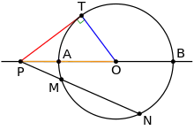 By the power-of-a-point theorem, the product of lengths PM · PN for any ray PMN equals to the square of PT, the length of the tangent line segment (red).