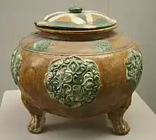 Sancai (Chinese: ; pinyin: sāncǎi; lit. 'three colours')[1] is a versatile type of decoration on Chinese pottery using glazes or slip, predominantly in the three colours of brown (or amber), green, and a creamy off-white. It is particularly associated with the Tang dynasty (618–907) and its tomb figures,[1] appearing around 700.[2] Therefore, it is commonly referred to as Chinese: 唐三彩 Tang Sancai in Chinese. Tang sancai wares were sometimes referred in China and the West as egg-and-spinach by dealers, for their use of green, yellow, and white, especially when combined with a streaked effect.[3]
