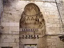 Its entrance is set inside a tall portal, considered "one of the finest niche-headed doorways in Jerusalem". Its elements are a combination of geometric precision and free-hand irregularity.[10] The top of the recess is a niche-like semi-dome covered with radiating flutes that merge into chevrons. The flute carving "is so delicate as to necessitate very fine joints between the voussoirs, and these have been most carefully set out".[10] The lower part of the semi-dome has three courses (rows) of muqarnas;[11] the lowest course features two shell ornaments "to give interest to the re-entering angles".[10]