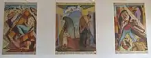 In 1930 several buildings on the plaza succumbed to fire, including the courthouse building and the Don Fernando Hotel. A new courthouse building was built and in 1933 and 1934 the Works Progress Administration funded the creation of murals within the courthouse. The frescoes were painted by Taos art colony members Emil Bisttram, Victor Higgins, Ward Lockwood and Bert Geer Phillips.[2]