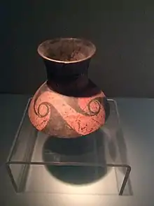 The cemetery contained over 1,500 burials. The burials at Taosi were highly stratified (the most stratified of Longshan sites), with burial wealth concentrated in the graves of a few males (nine large graves). The largest graves were placed in separated rooms with murals, had a large cache of grave goods (some with over 200 objects, including jades, copper bells, wooden and crocodile skin musical instruments); middle-size graves featured painted wooden coffins and luxury objects; most of the small graves did not have grave goods.[13] A single bronze bell was also found at a Taosi grave.