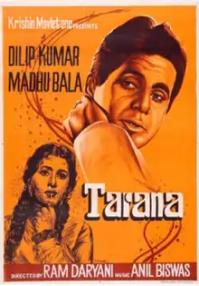 Tarana (transl. Anthem)[lower-alpha 1] is a 1951 Indian Hindi-language romantic comedy film produced and written by K. S. Daryani and directed by Ram Daryani. Starring Madhubala and Dilip Kumar together for the first time, Tarana revolves around the titular character (Madhubala), a free-spirited village girl who falls in love with a visiting doctor (Kumar).