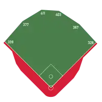 | Field size | Left Field – 339 feet (103 m) Left-Center – 377 feet (115 m) Center Field left corner – 411 feet (125 m) Center Field right corner – 403 feet (123 m) Right-Center – 367 feet (112 m) Right Field – 328 feet (100 m) ![]() |