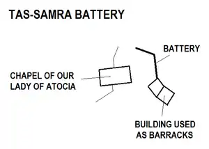 Tas-Samra Battery took its name from the Chapel of Our Lady of Atocia,[1] known as tas-Samra in Maltese, and originally dedicated to St. Nicholas.[2] The chapel, which had been built in 1631 on the site of an earlier church, stood at the rear of the battery. The battery itself had a paved gun platform and a parapet with five embrasures. It had an open rear, but this was shielded by the chapel as well as a number of other buildings and rubble walls. One of these buildings was used as a barracks, and a flagpole was affixed to the side of the building. The battery was also guarded by two small sentry boxes on the east side.[1]