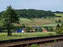 A long run through open fields leads to Usingen, where the line's central signal box is located and trains are stored, assembled, disassembled and refueled. This was formerly the location of the loading station of the 4 km-long narrow-gauge railway to a geyserite works (now Bremthaler Quarzitwerk)[3] and a siding from Raiffeisen Waren-Zentrale Rhein-Main (an agricultural cooperative). The section with the steepest grade (up to 2.147%) begins there; Wilhelmsdorf station, which is at the end of it, is a good 390 metres above sea level. A narrow gauge railway branched off here against the direction of travel to Merzhausen military airfield (now used for the Erdfunkstelle Usingen, Usingen earth station). After another slight climb past the junction of the BGS camp, the line reaches its high point at the edge of the forest. From there it goes to Grävenwiesbach, where some trains can be stored, and down around a loop to Hundstadt.