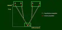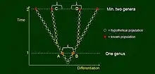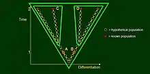 The paradox may be best illustrated by model diagrams similar to Darwin’s single evolutionary tree in On the Origin of Species.[4] In these tree graphs, dots represent populations and edges correspond to parent-offspring relations. The trees are placed into a coordinate system which is one-dimensional (time) for a single lineage, and two-dimensional (differentiation vs. time) for cladogenesis or evolution with divergence.