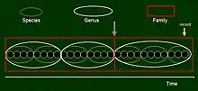 In the single lineage model we now consider a sequence of populations along an extremely long time axis, say several hundred million years, with the last dot representing an extant population. In the figure there is space for a few dots even though edges between adjacent populations are hidden. We could use a second axis to express differentiation, but it is not necessary for our purposes. Here we assume that there is no extinction and all branching events are disregarded (if there were no branches at all, then the changes would correspond to a typical anagenesis. Classification of organisms along this sequence into species is shown by small ellipses. If the differences between certain species are judged to be large enough to justify classification into distinct genera, then generic separators must each coincide with a between-species boundary. If differences reach family-level differentiation, which is easy to imagine over the very long time we consider here, the consequence is that a family-level border must overlap with a between-genus and, in turn, a between-species border (gray arrow in the figure). One cannot imagine, however, that a parent and its offspring are so distinct that they should be classified to different families, or even genera – that would be paradoxical. This illustrates Dawkins’ above argumentation on human ancestry at the level of genera, Homo and Australopithecus.