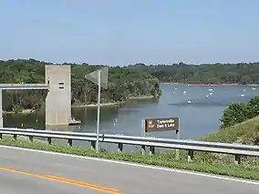 Taylorsville Lake gains its name from the nearby town, named for President Zachary Taylor's father, Richard Taylor, who donated 60 acres (24 ha) of his own land for creation of the town.[1] The lake was created when the United States Army Corps of Engineers chose to dam the Salt River, thereby creating the lake, with its public opening in January 1983. The dam, which measures a height of 163 feet (50 m) and a length of 1,280 feet (390 m), cost $28.8 million to build. The resulting lake is 3,050 acres (1,230 ha) in total area, has 75 miles (121 km) of shoreline, and is 18 miles (29 km) long.[3]