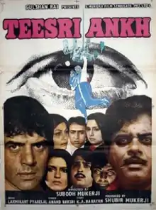 Teesri Ankh (transl. The Third Eye) is a 1982 Hindi-language action thriller film directed by Subodh Mukherji[2] and produced by Subir Mukherjee. It features an ensemble cast of Dharmendra, Shatrughan Sinha, Rakesh Roshan, Zeenat Aman, Neetu Singh, Sarika, Amjad Khan and Nirupa Roy. The film was delayed for 5 years. Eventually the film