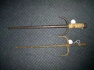 The tekpi[2] is a short-handled trident from Southeast Asia. Known as tekpi in Malay, it is called chabang or cabang (Dutch spelling: tjabang meaning "branch") in Indonesian,[3] siang tépi (雙短鞭 lit. 'double short whip') in Hokkien, and trisul (ตรีศูล lit. 'trident') in Thai. More than a weapon, it was also important as a Hindu-Buddhist symbol. It is comparable to the Okinawan Sai.