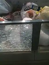 Tempered safety glass which has been laminated often does not fall out of its frame when it breaks – usually because an anti-splinter film has been applied on the glass, as seen in this grocery store meat case.