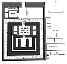 However, the Austrian excavations showed that under the temple stretched an older settlement, which could be dated by pottery to the first half of the 12th Dynasty. The temple itself was given a new construction date at c. the mid-12th Dynasty, probably at year 5 of Senusret III, as indicated by the above-mentioned stela.[5] The entrance was on the north side, where the walls were stronger and it seems that they formed a brick pylon. The entrance was at one time perhaps framed by inscribed limestone slabs.[6] The proper temple stood within an open courtyard. On the west side behind the main gate there was small temple, while the main one was opposite the north entrance. Behind the entrance of the temple proper stood a courtyard with perhaps eight columns. Some stone column bases were still found. East and west of this courtyard were on either side two smaller chambers, while on the south side were three cult chapels. This temple was placed within a larger complex. On the east side were excavated remains of storage and administrative buildings.